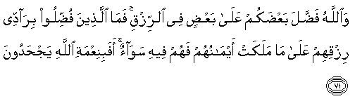 "And Allah has favored some of you above others in wealth and properties. Now those who are more favored will by no means hand over their wealth and properties to the slaves that their right hands possess..." AN NAHL (16:71)